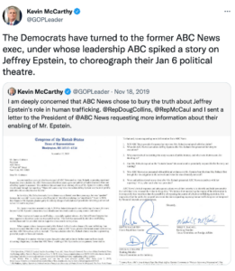 Nancy Pelosi’s illegitimate sham January 6th Committee secretly hired the former president of ABC News, James Goldston to be the secret producer for their shameless primetime hearings. This is the same producer who prevented the network from airing an interview with one of Jeffrey Epstein's victims. Axios reported this morning: "James Goldston — former president of ABC News, and a master documentary storyteller who ran "Good Morning America" and "Nightline" — has joined the committee as an unannounced adviser…"In 2019, "Good Morning America" reporter Amy Robach was caught on a hot mic claiming network brass scrapped her interview with a Jeffrey Epstein accuser to appease the Royal Family. Leader Kevin McCarthy sent a letter to Goldston following this revelation, demanding answers for why the interview was scrapped and alleging that the network and Goldston "enabled" Epstein to continue his illegal conduct by not airing the interview and blowing the whistle on his sex trafficking ring. "I am deeply concerned that this victim, in search of justice, went to ABC News, provided information and an interview, and then ABC News chose to bury the truth. This was a decision that Ms. Robach alluded was due to protecting powerful people or financial interests," McCarthy wrote. The appointment of Goldston to Pelosi's witch-hunt is just further proof that this is nothing more than a disgusting sham aimed at distracting the American people.