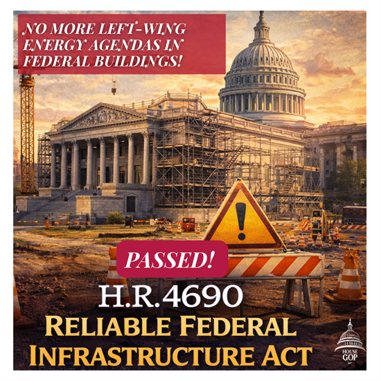 WASHINGTON—House Republicans today advanced H.R. 4690, the Reliable Federal Infrastructure Act, a bill led by Rep. Nick Langworthy (R-N.Y.). The bill repeals federal building standards that penalize the use of fossil fuels and protects energy choice in federal construction.