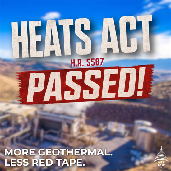 WASHINGTON—House Republicans today advanced H.R. 5587, the HEATS Act, a bill led by Rep. Young Kim (R-Calif.). This legislation allows geothermal projects to move forward under state permits and eliminates duplicative federal delays.